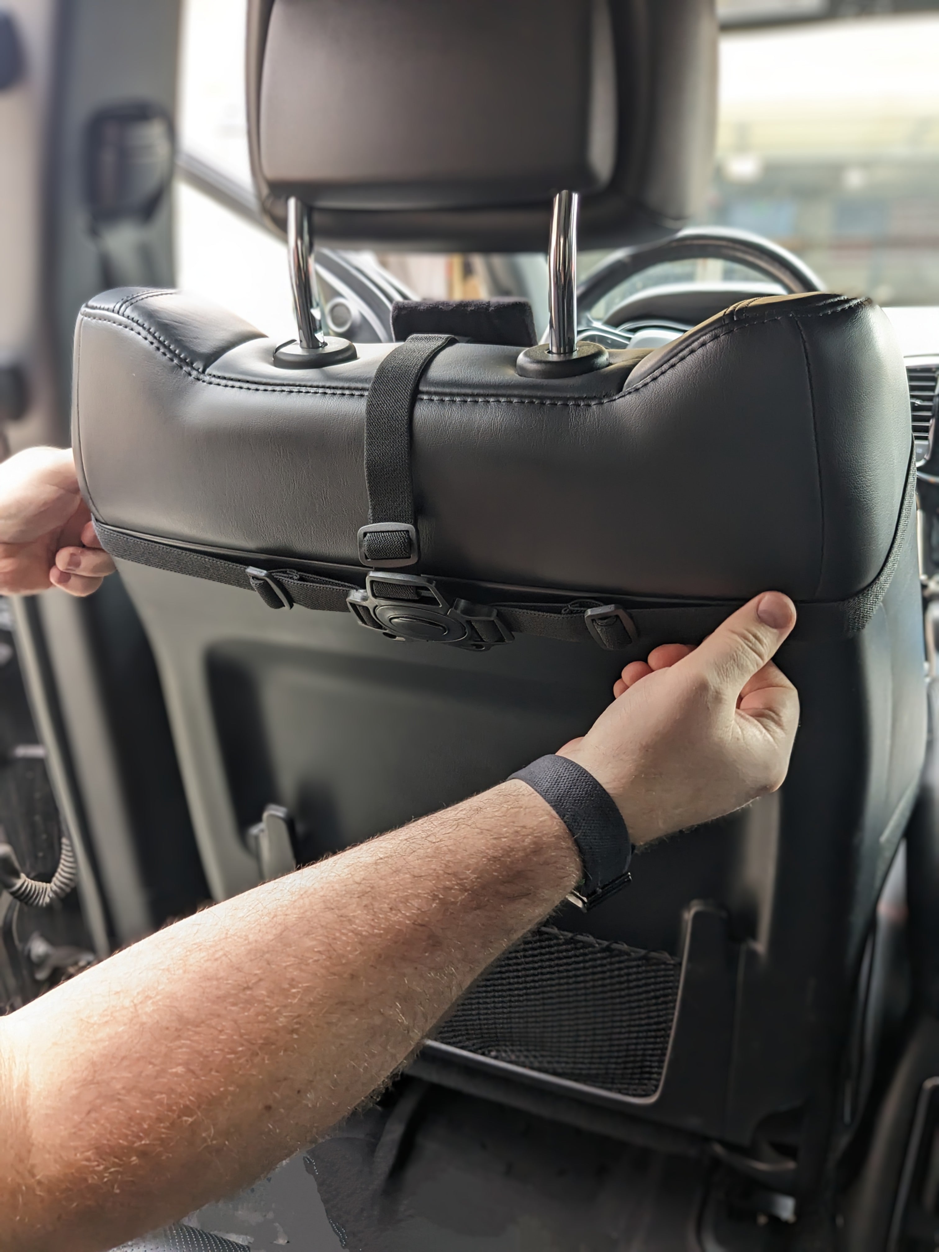 - If possible, start by placing the vertical strap in between the seatback and the headrest...that little space that's created when the headrest is raised up.